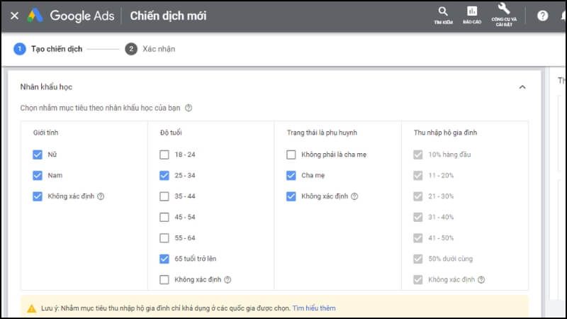 Nhân khẩu học: Chọn giới tính, độ tuổi, tình trạng hôn nhân và thu nhập của đối tượng bạn muốn nhắm đến.
